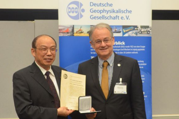 德国地球物理学会会长Michael Korn为汪荣江颁奖(图片来自GFZ官网)