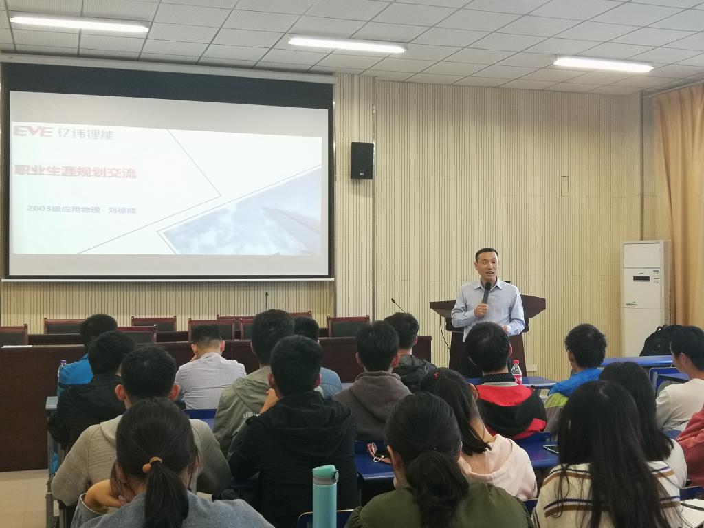 10月25日,世界杯(中国)举办优秀校友报告会,2003级应用物理学专业校友、惠州亿纬锂能股份有限公司人力资源总监刘德成应邀在明道楼一楼报告厅作励志专题报告,学院2017级应用物理学、光电信息科学与工程专业70余名学生参加了会议。会议由学院党委副书记(兼副院长)张可佳主持。