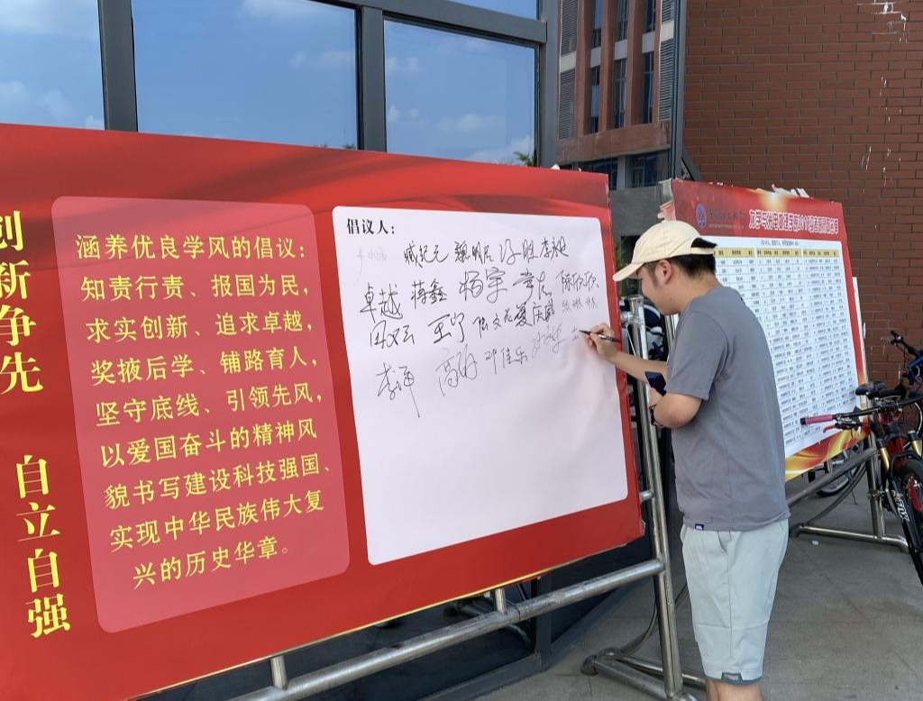 科学家是科学知识和科学精神的重要承载者,科研作风和学风是决定科技事业成败的关键。钱学森、于敏、林巧稚、钟南山、彭士禄、袁隆平、张荣桥、屠呦呦等老一辈科学家突出的事迹展现了中国科学家精神:胸怀祖国、服务人民的爱国精神;勇攀高峰、敢为人先的创新精神;追求真理、严谨治学的求实精神;淡泊名利、潜心研究的奉献精神;集智攻关、团结协作的协同精神;甘为人梯、奖掖后学的育人精神。他们为后辈学子树立了榜样,同时也对青年学生提出优良学风的倡议:知责行责、报国为民,求实创新、追求卓越,奖掖后学、铺路育人,坚守底线、引领先风。学院领导对研究生提出殷切的期望,期望同学们继承和发扬老一辈科学家坚持国家和人民利益至上,弘扬追求真理、实事求是、严谨治学、淡泊名利、立德为先的科学家精神,切实加强作风和学风建设。活动最后,师生在倡议书上庄严地签下自己的名字,表达了诚信治学的态度和决心。