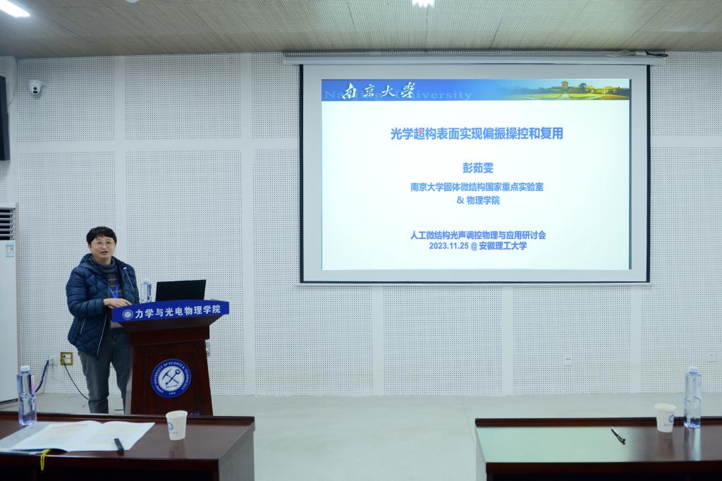 南京大学彭茹雯教授、南方科技大学高振教授、苏州大学徐亚东教授以及浙江大学熊波研究员分别作题为《光学超构表面实现偏振操控和复用》、《三维光学拓扑相》、《相位梯度超构表面异常衍射特性及物理》、《超表面中多维光场调控及其智能优化设计》的特邀报告。来自南京大学、武汉大学、南方科技大学、合肥工业大学、湖北大学以及安徽理工大学等单位的参会代表分别做了十余场报告。报告精彩纷呈,内容涵盖人工微结构光学原理探索,微结构光、声场调控以及拓扑光、声子学,超构材料、超构表面的设计与应用等研究方向,展现了基于人工微结构的光声调控重要进展和学术成果,与会代表积极交流探讨,研讨会现场学术氛围浓厚、气氛热烈。
