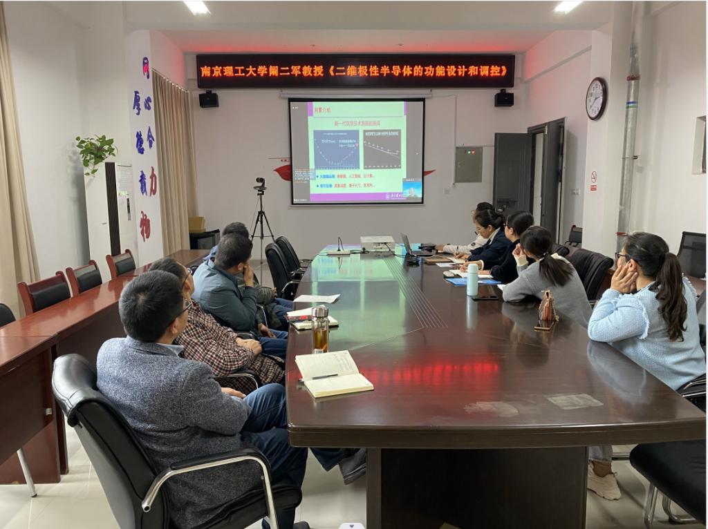 应科研部和力学与光电物理学院邀请,10月28日下午南京理工大学阚二军教授作学术交流并作了题为《二维极性半导体的功能设计与调控》的报告。交流会采用线上线下相结合的形式进行,副院长高娟主持交流会,研究生和相关领域教师80余人线上线下同步聆听了报告。