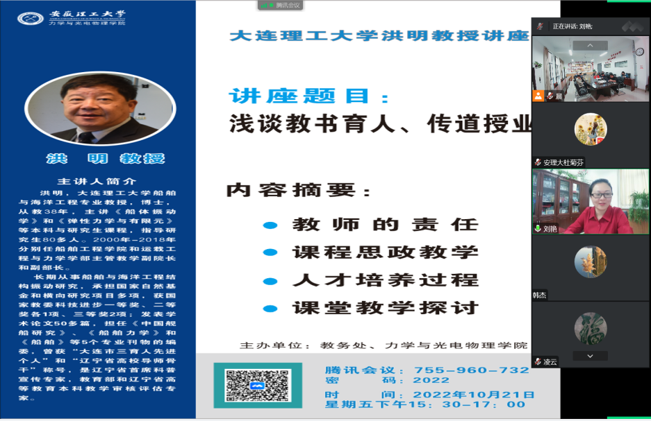 应教务处、力学与光电物理学院的邀请,10月21日下午,大连理工大学洪明教授为世界杯体彩教师作了题为《浅谈教书育人、传道授业》的线上报告。报告会由力学与光电物理学院党委书记刘艳主持。