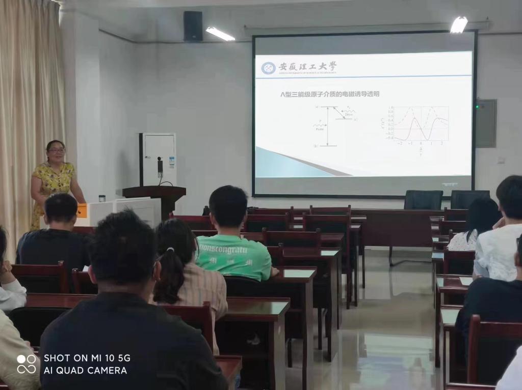 本次报告会有效拓宽了学院研究生和本科生的视野,激发了学生的科研兴趣,对学院研究生培养质量的进一步提升起到了积极作用。 9月19日下午,力学与光电物理学院潘桂侠副教授在明道楼A323报告厅做了题为《二能级原子耦合腔光机械系统的多电磁诱导透明研究》的学术报告。学院研究生、本科生及青年教师60余人聆听了报告。