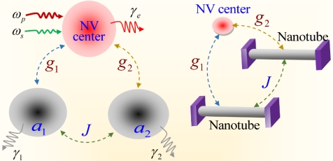 本文基于自旋-机械混合量子系统与机械模耦合,提出在典型的自旋-机械混合量子系统(如NV自旋-碳纳米管振子)的基础上引入另一个碳纳米管机械振子,如下图所示。
