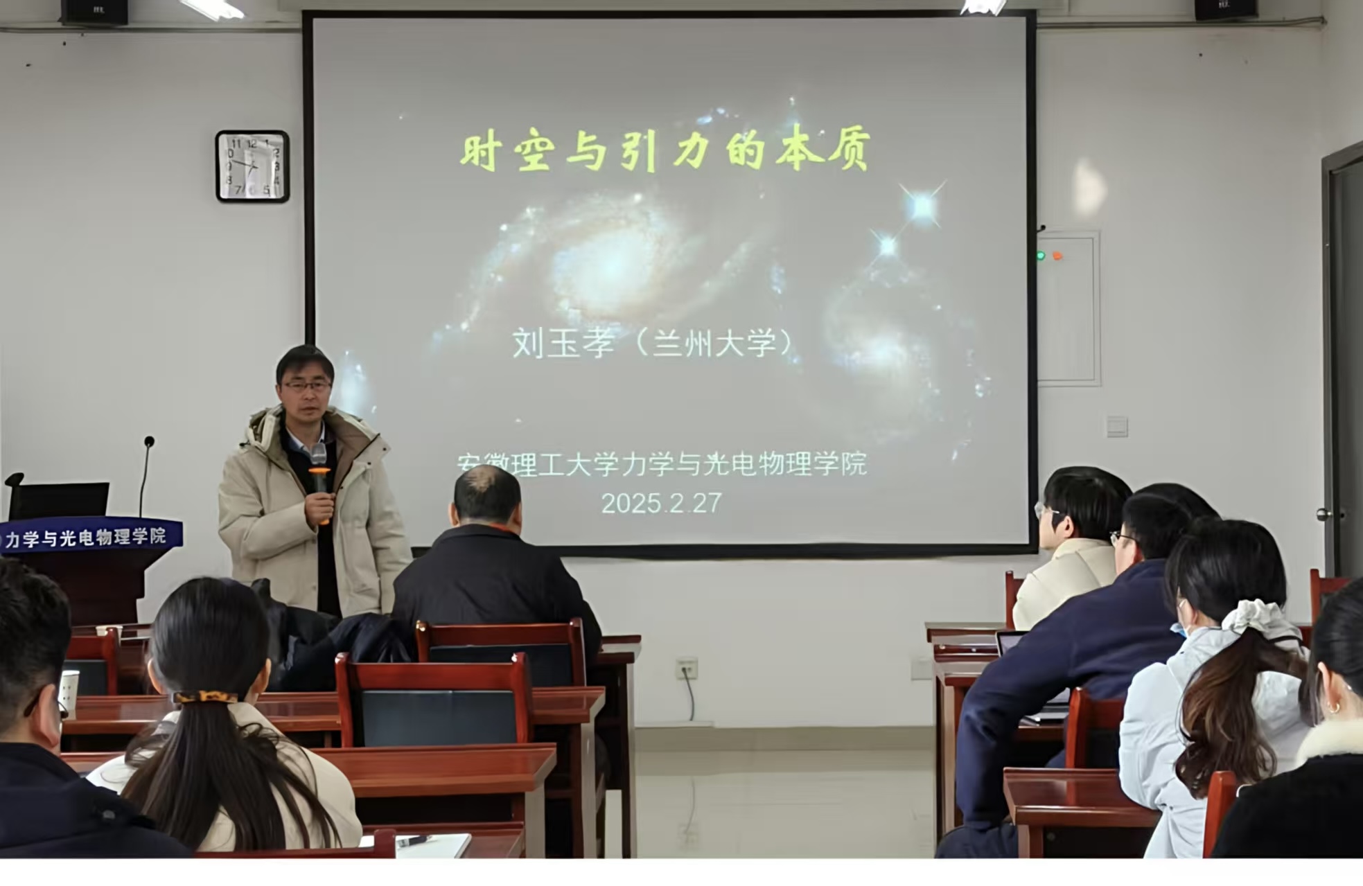 应科研部和力学与光电物理学院邀请,2月27日上午,兰州大学刘玉孝教授在明道楼A321报告厅作题为《时空和引力的本质》的学术报告。报告会由世界杯(中国)基础物理研究中心执行主任王昕杨主持,学校部分教师和研究生参加了此次报告会。