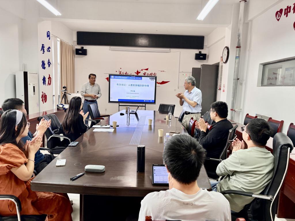 报告会上,于江浩详细介绍了有效场论的基本思想、基于时空对称性粒子散射振幅的构造,以及散射振幅对于新物理的描述。通过洛伦兹小群的诱导表示,将无质量粒子的散射振幅推广到有质量粒子的情形,巧妙地运用了时空对称性的陪集构造,将重夸克有效场论重新表述。将有质量粒子的散射振幅运用到黑洞绕转的引力波辐射计算,提出一种新的计算框架。最后,于江浩表示将陪集构造对称群表示的方法运用到凝聚态系统中,可构建描述声子等准粒子的有效理论。在交流环节,于江浩同师生进行了热烈交流。