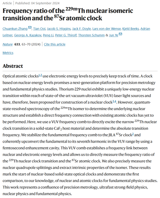“9月4日,科罗拉多大学博尔德分校、美国国家标准与技术研究院(NIST)、维也纳工业大学、IMRA America公司、慕尼黑大学组成的研究团队在《Nature》期刊上发表题为“Frequency ratio of the Th-229m nuclear isomeric transition and the Sr-87 atomic clock”(钍-229m核异构跃迁和锶-87原子钟的频率比)的研究论文,张传坤博士为论文第一作者兼共同通讯作者,叶军院士为论文共同通讯作者。张传坤等人通过一个定制的频率梳驱动原子核中的跃迁,向核钟的开发迈出了巨大的一步,这种核钟有可能记录到支配物理世界的基本常数中最细微的变化。这篇论文从投稿到接收仅仅27天,且被选为当期封面,并同时被《Nature》的nature podcast系列、news & views系列、news系列、editorials系列以及《Science》的News系列报道。”