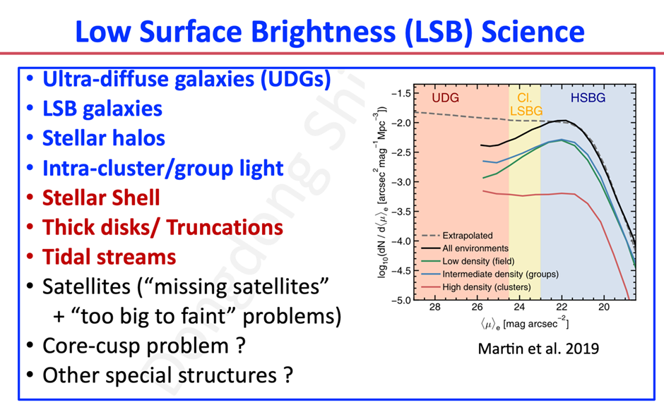 传统天文观测受限于仪器杂散光和天光背景噪声(如气辉、黄道光等),难以探测表面亮度低于 24 mag/arcsec² 的暗弱天体。随着天文技术的发展,现代成像技术通过杂散光抑制、多波段背景建模与深度曝光(极限可达31 mag/arcsec²),揭示了近邻宇宙低面亮度结构、星系恒星晕、潮汐流、超弥散星系(UDGs)以及星系群/团内光(IGL/ICL)。值得注意的是,UDGs的极端特性挑战暗物质理论:暗物质主导型(如DF44,暗物质占比98%)与缺失型(如NGC1052-DF2,速度弥散低于10 km/s)并存,推动ΛCDM模型修正。